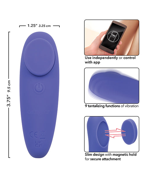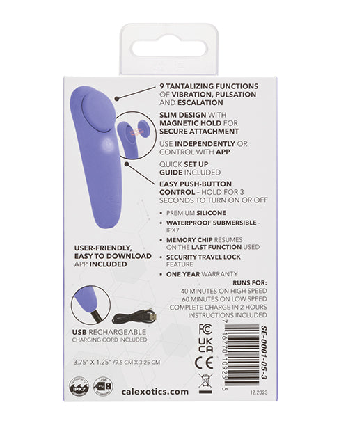 Step into a world where discretion meets delight with the CalExotics Connect Panty Teaser, a revolutionary device that blends technology with sensuous pleasure. This sleek and slim panty teaser offers an exciting way to enhance your intimate moments, whether you’re indulging in solo play or spicing things up with a partner. This panty teaser can be used independently or controlled via a user-friendly, easy-to-download app. This innovative feature allows for an exhilarating level of control and creativity in your play, enabling you and your partner to explore new realms of pleasure from near or afar. The app’s intuitive design makes it simple to explore and enjoy the various settings, adding an element of surprise and excitement to your experiences. Its slim design and magnetic hold ensure secure attachment, promising uninterrupted pleasure. Equipped with 9 functions of vibration, pulsation, and escalation, the panty teaser offers a diverse range of sensations to explore. Each function has been carefully crafted to deliver a unique experience, allowing you to tailor your pleasure journey to your current desires. Whether seeking gentle waves of sensation or more intense stimulation, this panty teaser adapts to your needs, enhancing every encounter. It is not only innovative but also easy to use and convenient. Crafted from body-safe Silicone and 100% waterproof with an IPX7 rating, it invites experimentation in various settings, broadening the scope of your pleasure pursuits. The state-of-the-art memory chip resumes on the last function used, and the security travel lock feature, activated by a three-second hold, ensures discretion and easy travel. USB rechargeable and complete with a charging cord, it offers a full charge in 2 hours, with 40 minutes of high-speed enjoyment or 60 minutes on a lower setting. Experience pleasure like never before with the CalExotics Connect Panty Teaser, a pathway to new and exciting sensations, providing a deeply satisfying experience. App-enabled.