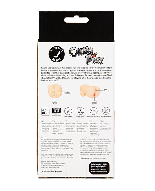 Experience unparalleled pleasure with the Cutie Pies Secretary Sasha Ass & Pussy Stroker, designed to take your intimate moments to new heights. With Sasha, every session feels like an exclusive rendezvous where you are in complete control.Crafted from soft and supple TPE material, Sasha offers a lifelike sensation that elevates your experience. Her 6.5-inch deep vaginal and anal openings are uniquely textured and open-ended for effortless cleaning. Plus, the included removable bullet creates intense vibrations, ensuring that every stroke delivers over-the-top stimulation. Compact and discreet, Sasha is easy to take with you, making her the perfect companion for those on-the-go adventures.Don’t wait any longer to indulge in your fantasies with Sasha. Transform your private moments and discover why this secretary is the ultimate addition to your collection. Order yours today and get ready to redefine pleasure.Product Details:• Are you ready to show her whos boss? Her tight vaginal and anal openings are 6.5 inches deep, uniquely textured and open-ended for easy cleaning.• An added hole perfectly fits the included removeable bullet for over-the-top vibrations with every stroke.