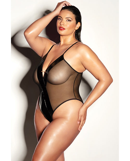 FETISH Finesse Soft Cup Vinyl & Mesh Teddy w/Barbell Black 1X/2X