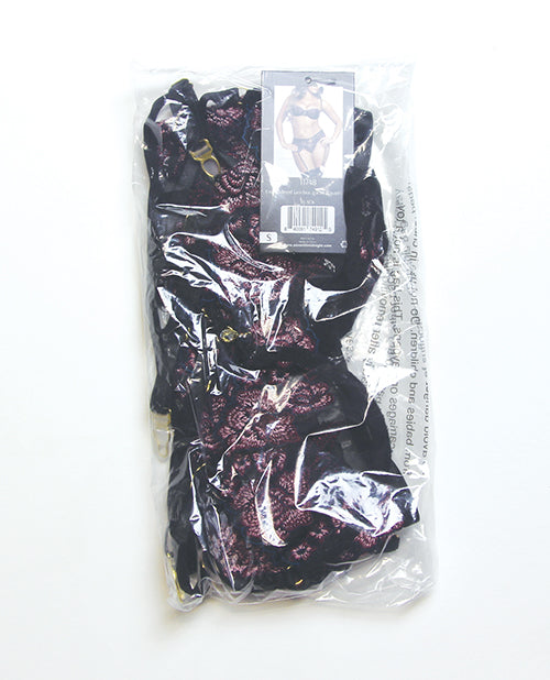 Floral Lace and Mesh Underwire Bra w/Garter & Thong 3 pc Set – Black/Purple XL