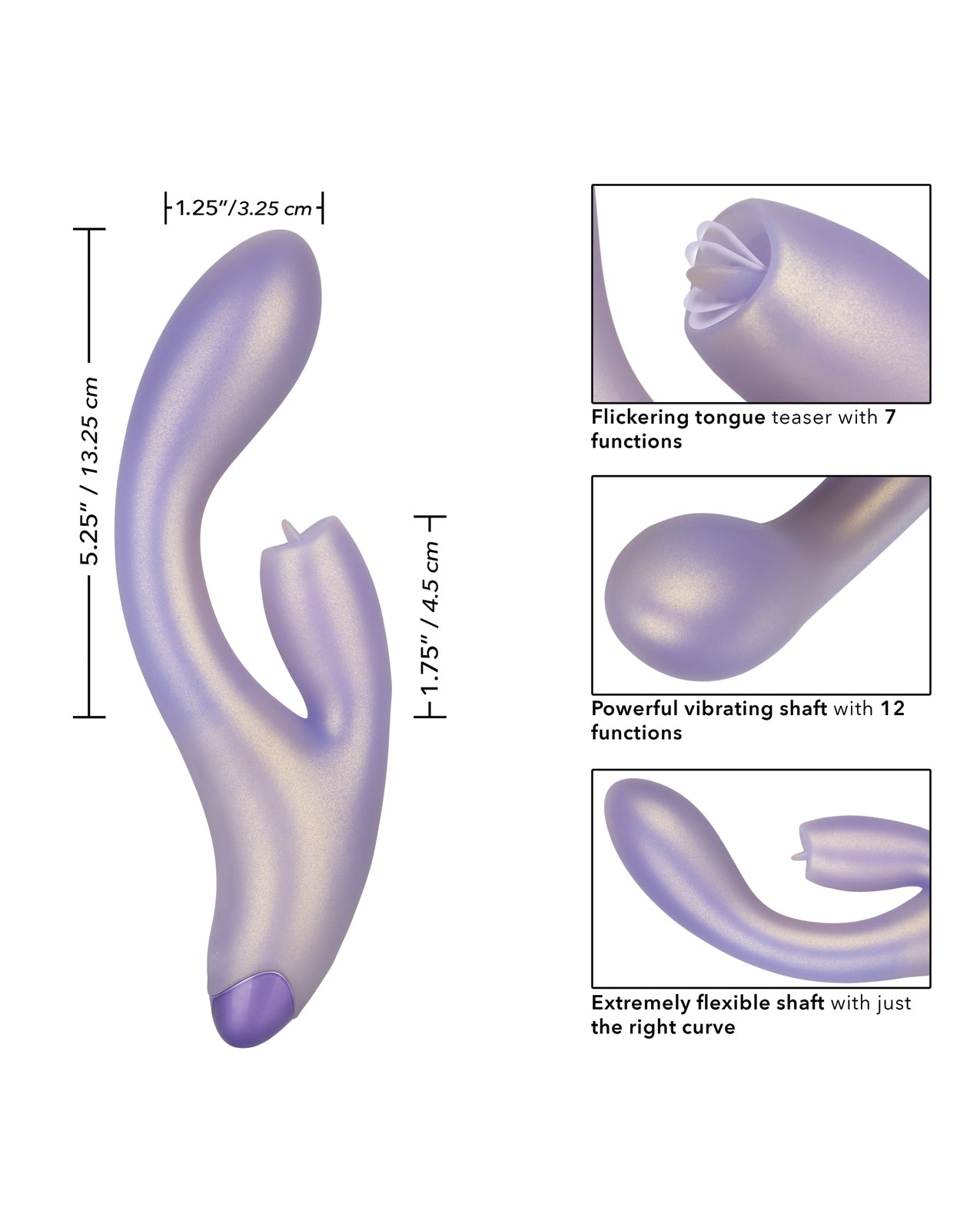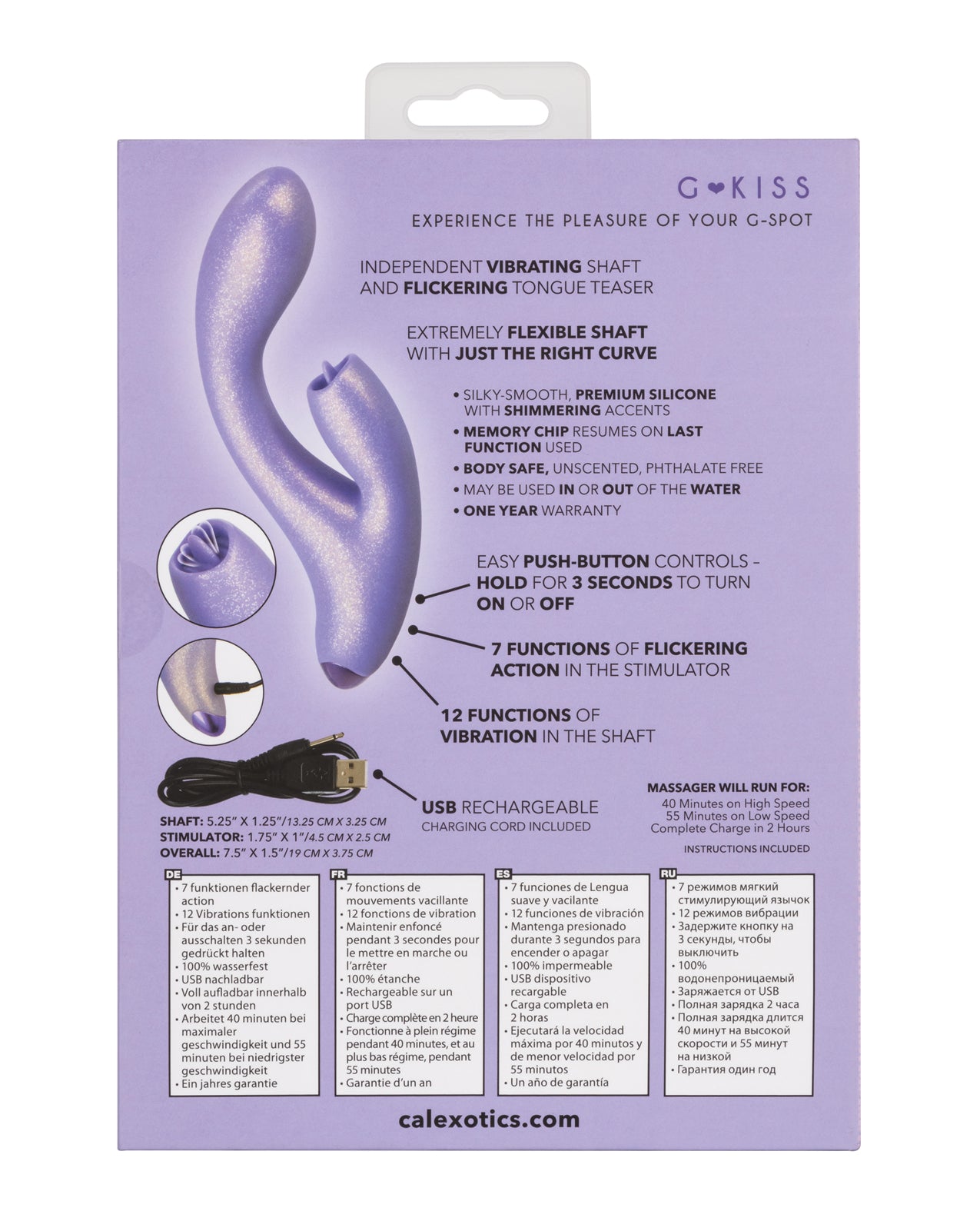 Experience unparalleled pleasure with the G-Love G-Kiss – Purple, your ultimate companion for intimate moments. This dual stimulating massager is designed to elevate your self-love journey, delivering sensations that will leave you breathless.Crafted for maximum enjoyment, the G-Love G-Kiss features a flexible G shaft that easily adapts to your bodys unique contours. With 12 powerful vibration settings and 7 tantalizing flickering functions, this device is engineered to tease both internal and external pleasure points. The silky smooth silicone surface and sensually curved design ensure that every touch feels luxurious, while the flickering tongue-like teaser adds an extra layer of excitement to your experience.Don’t wait to indulge in the pleasure you deserve. Embrace the sensation of the G-Love G-Kiss – Purple and discover a new world of intimate satisfaction today.Product Details:• Love yourself just right with the flexible G shaft, 7 independent functions of flickering action and 12 independent functions of vibrations.• For an ultra smooth surface and flexible body, the curved stimulator and massager are covered in a shimmering Silicone This silky smooth vibrator is packed with 12 functions of vibration and 7 independent functions of flickering stimulation made just for you.• The easy-touch control buttons let you effortlessly flicker through each function of vibration, while increasing or decreasing the function intensity.• Whether youre taking a dip with a lover or indulging in a steamy solo session, look forward to up to 55 minutes of waterproof vibration.• Recharge pleasure and get back to playtime in only 2 hours with the provided USB cable.• This body safe material is unscented and phthalate free to keep your most sensitive spots happy and healthy.• 7.5″ x 1.5″ / 19cm x 3.75cm (Overall).• 5.25″ x 1.25″ / 13.25cm x 3.25cm (Shaft).• 1.75″ x 1″ / 4.5cm x 2.5cm (Stimulator).• One Year Warranty.
