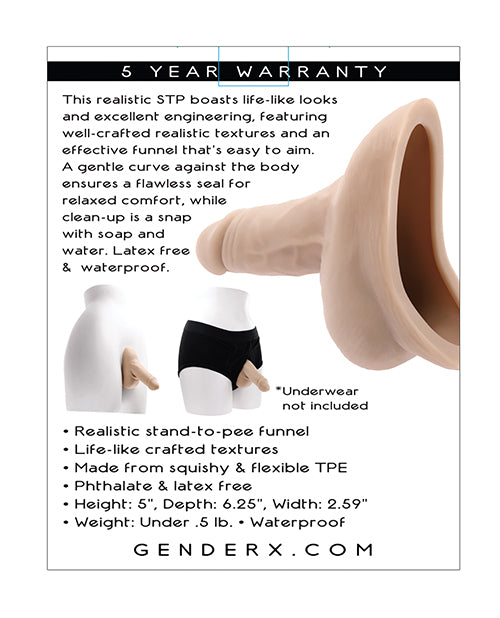 Experience freedom and confidence with the Gender X Stand To Pee – Light, designed for those who want a discreet and comfortable way to relieve themselves while standing. This innovative product seamlessly combines functionality with realism, allowing users to navigate their environment with ease.The Gender X Stand To Pee – Light features meticulously crafted textures that mimic natural anatomy for a lifelike appearance. Its effective funnel design ensures precision aiming, while the gentle curve allows for a secure seal against the body, enabling worry-free use. Cleaning is effortless with just soap and water, and the latex-free and waterproof construction guarantees durability. Plus, you can enjoy peace of mind with a five-year warranty.Dont miss out on the chance to enhance your daily experienceorder the Gender X Stand To Pee – Light today and enjoy the perfect blend of comfort and practicality. Embrace the convenience and take the next step toward freedom.Product Details:• Latex free & waterproof.• Five year warranty.