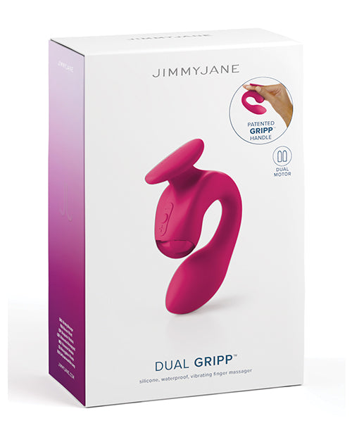 Experience unparalleled pleasure with the JimmyJane Dual Gripp, designed to deliver mind-blowing simultaneous g-spot and clitoral stimulation. This innovative massager transforms your intimate moments, allowing you to explore a world of sensations effortlessly.The Dual Gripp features a unique holder that slips comfortably between your fingers, granting you complete control over its powerful dual motors. With 25 high-performing vibration functions to choose from, you can easily toggle between settings for a customized experience. Crafted from super soft, flexible silicone that is both phthalate-free and latex-free, this vibrator ensures a safe and pleasurable experience every time.Ready to elevate your pleasure? Discover the limitless possibilities of the JimmyJane Dual Gripp and unlock your next best orgasm today. Dont waitindulge in a new dimension of satisfaction now.Product Details:• The powerful dual motor design toggles between 25 high-performing vibration functions for mind-blowing simultaneous g-spot and clitoral stimulation.• Choose between 25 high-performing functions (five vibration modes with five speeds per mode) 60 minute run-time.• Waterproof; fully submersible, bath-friendly, and washable.• Rechargeable, magnetic usb cord and cloth storage bag included.