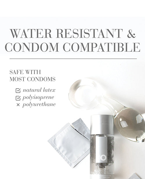Experience the ultimate in relaxation and sensual pleasure with JO All-In-One Massage Glide. This fragrance-free formula not only enhances your intimate moments but also provides a silky, long-lasting glide that transforms every touch into a soothing experience.Crafted with a premium silicone base, JO All-In-One Massage Glide delivers a buttery feel that lasts much longer than traditional oils. Its unique formula dries down to a matte, soft-touch finish, ensuring that you and your partner can fully enjoy the moment without any sticky residue. A little goes a long way; just one drop is equivalent to ten drops of typical massage oil, making this an efficient and economical choice for those who cherish pleasure and intimacy.Elevate your intimate experiences and indulge in the luxurious feel of JO All-In-One Massage Glide. Order now to unlock a new level of connection and relaxation in your life.