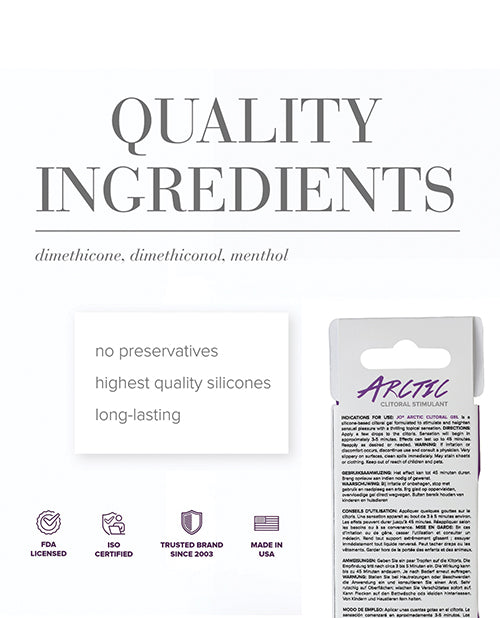Experience a new level of pleasure with JO Arctic Clitoral Gel, the ultimate cooling stimulant designed to enhance your intimate moments. This powerful formula elevates sensation and sensitivity, transforming your foreplay and solo play into an exhilarating adventure.JO Arctic features a maximum strength silicone-based formula enriched with menthol, delivering a refreshing cooling or tingling sensation that awakens your most sensitive areas. Its unique blend is compatible with glass, metal, ABS, ceramic, and non-porous toys, ensuring a versatile and delightful experience. Please note, it is not tested for use with condoms, so plan accordingly for your enjoyment.Unlock the full potential of your sensual encounters by adding JO Arctic Clitoral Gel to your collection. Indulge in the invigorating sensations that awaityour body will thank you.