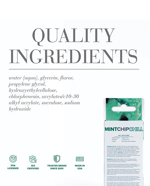 Discover the delightful sensation of JO Mint Chip Chill, a mint chocolate stimulant designed to elevate your intimate moments. Experience the refreshing burst of mint combined with the indulgent warmth of rich chocolate, creating an enticing formula that arouses and excites.This 0.34 oz water-based arousal gel is expertly crafted to provide extraordinary clitoral stimulation. The unique blend of flavors offers a kissable experience that heightens sensitivity and pleasure, making every touch feel tantalizing. Its smooth texture ensures easy application, allowing you to focus on the sensations that matter most.Unlock the full potential of your intimate experiences with JO Mint Chip Chill. Indulge in this aromatic delight today and transform your moments of passion into unforgettable adventures.