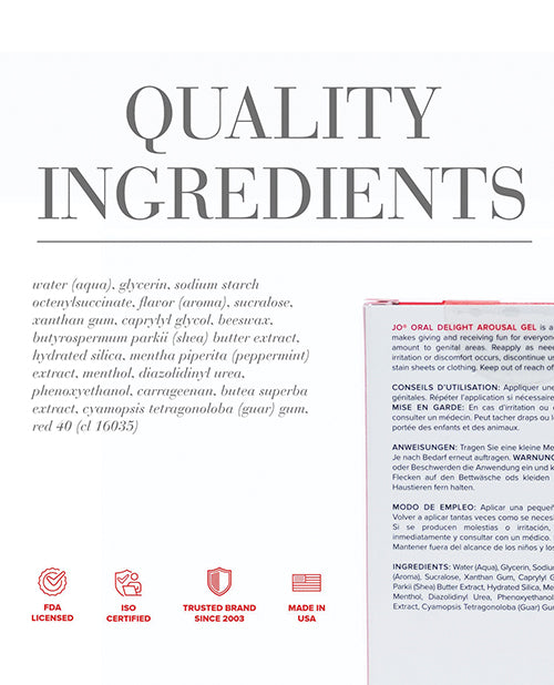 Experience a new level of intimacy with JO Oral Delight – Strawberry Stimulant. This tantalizing formula enhances pleasure and transforms foreplay into an unforgettable experience.Crafted with an intense strawberry flavor and a long-lasting cooling sensation, JO Oral Delight makes both giving and receiving a delightful adventure. Its water-based formula ensures easy cleanup, allowing you to focus on pleasure without the worry of mess. Key ingredients like Butea Superba Extract work to boost sexual desire, while Menthyl Lactate provides a refreshing coolness that elevates sensations without irritating the skin.Indulge in the ultimate pleasure with JO Oral Delight – Strawberry Stimulant. Elevate your intimate moments and explore new sensations today.