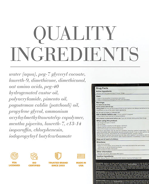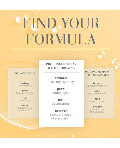 Experience longer-lasting intimacy with JO Prolonger Spray Lidocaine, a specially formulated desensitizer designed to help you maintain control and enhance pleasure. This 2 oz spray is your key to prolonging those precious moments, allowing you and your partner to savor every second together.JO Prolonger Lidocaine features a precise metered sprayer that ensures consistent dosage with every application, providing a reliable experience every time. With an active ingredient concentration of 10% Lidocaine, this FDA-regulated spray works to gradually numb sensation, giving you an estimated duration of 30-45 minutes of extended enjoyment. It’s important to note that this product is not compatible with polyisoprene condoms, so be sure to consider your options.Take the first step toward a more fulfilling intimate experience. Add JO Prolonger Spray Lidocaine to your collection today and embrace the freedom to enjoy longer-lasting connections.Product Details:• JO Prolonger Lidocaine provides a more gradual numbing with estimated duration at 30-45 minutes.