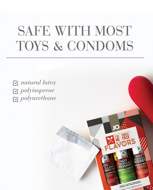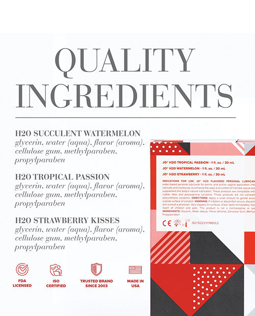 Elevate your intimate experiences with the JO Tri-Me Triple Pack, featuring three irresistible flavors designed to tantalize your senses. Each 1 oz bottle promises to transform every moment into a delightful adventure, ensuring pleasure is always within reach.This gift set showcases some of JO’s best-selling water-based, fruit-flavored lubricants, including H2O Succulent Watermelon, H2O Tropical Passion, and H2O Strawberry Kisses. Whether you choose to use them individually or mix and match, these delightful formulas enhance intimacy while providing a smooth, sensual glide. The compact size makes it easy to take on the go, allowing you to indulge in pleasure wherever you are.Dont wait to spice up your intimate moments. Grab the JO Tri-Me Triple Pack today and discover the flavors that will ignite your passion.