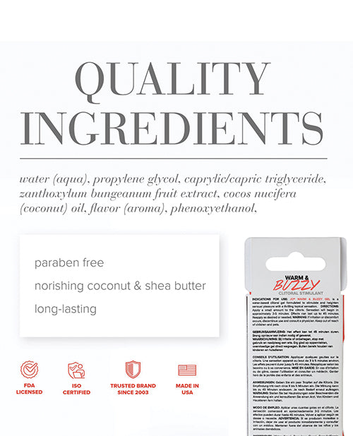 Experience heightened pleasure with JO Warm & Buzzy – Original Stimulant, designed to amplify sensations and sensitivity for unforgettable intimate moments. This maximum strength formula delivers a unique warming and tingly experience that transforms foreplay and solo play into something extraordinary.Crafted for those seeking enhanced stimulation, JO Warm & Buzzy features a luxurious silicone-based texture that glides smoothly, ensuring comfort and ease of use. Each 0.34 oz tube contains enough product for up to 45 applications, allowing you to explore and indulge at your own pace. With its water-resistant properties, this stimulant stays exactly where you want it, enhancing your experience without interruption.Don’t hold back on elevating your sensual experiences. Try JO Warm & Buzzy today and discover the tantalizing pleasure youve been missing.