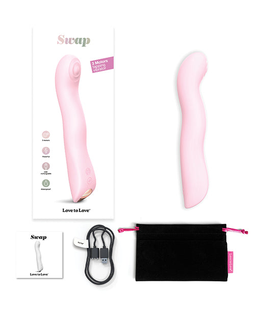 Experience unparalleled pleasure with the Love to Love Swap Tapping Vibrator in Baby Pink. Designed for versatility, this incredible device adapts to your desires, ensuring every moment is filled with excitement and satisfaction.Equipped with triple motors, the Swap offers a unique combination of tapping and vibration that targets your most sensitive areas. Its anatomically designed curves provide a perfect fit for G-spot or P-spot stimulation, catering to everyones preferences. Additionally, the waterproof feature allows for adventurous play in the shower, making it easy to explore your fantasies without limits.Dont miss out on the opportunity to elevate your intimate moments. Embrace your curiosity and discover the endless possibilities that the Love to Love Swap Tapping Vibrator has to offermake it yours today!Product Details:• Designed for everyone and to meet all desires, it offers two distinct stimulations: tapping and vibration.• Have fun in the shower, it’s waterproof.