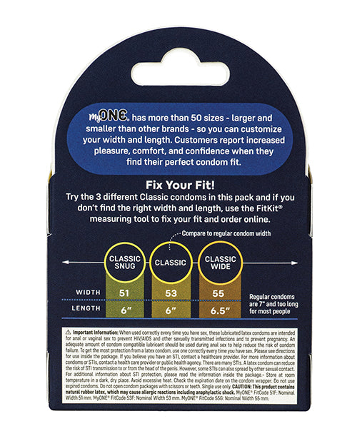 Experience ultimate comfort and pleasure with My One Classic Sampler Condoms – Pack of 3. Designed to ensure a perfect fit, these condoms eliminate discomfort and enhance your intimate moments.MyONE Custom Fit revolutionizes the way you think about condoms by offering an unparalleled selection of sizes. With 10 length options and 9 width options, you can choose from a total of 52 custom fit sizes that cater to your unique needs. Say goodbye to slippage and discomfort, and enjoy a more pleasurable experience with a condom that fits just right.Don’t compromise on your comfort and pleasure any longer. Try the My One Classic Sampler today and discover the difference that a perfect fit can make in your intimate life.Product Details:• MyONE has 10 length options and 9 width options, for a total combination of 52 custom fit condom sizes.