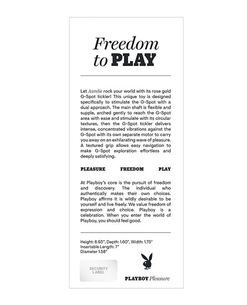 Unlock a new level of pleasure with the Playboy Pleasure Aurelie G-Spot Vibrator in Teal. This luxurious vibrator is expertly designed to deliver intense G-Spot stimulation, ensuring every moment is filled with blissful ecstasy.The Aurelie features a rose gold G-Spot tickler that is specifically crafted to enhance your intimate experience. With its flexible and supple main shaft, this vibrator gently arches to precisely target the G-Spot, while the separate motor provides concentrated vibrations for heightened pleasure. A textured grip allows for effortless navigation, making your exploration of pleasure both easy and satisfying.Dont miss out on the opportunity to elevate your pleasure journey. Indulge in the Aurelie G-Spot Vibrator today and experience the exhilarating sensations that await you.Product Details:• The main shaft is flexible and supple, arched gently to reach the G-Spot area with ease and stimulate with its circular textures, then the G-Spot tickler delivers intense, concentrated vibrations against the G-Spot with its own separate motor to carry you away on an exhilarating wave of pleasure.• Five Year Warranty.
