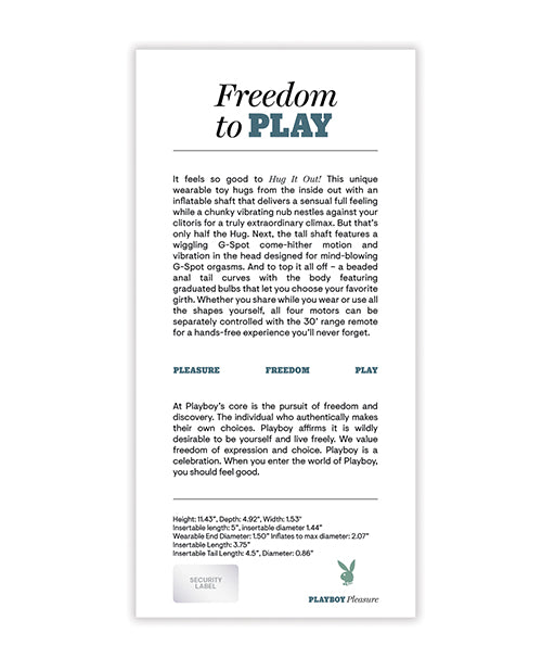 Experience unparalleled pleasure with the Playboy Pleasure Hug It Out – Acai, a revolutionary wearable toy designed to provide intense stimulation and satisfaction. This innovative device embraces you from the inside out, delivering a deeply fulfilling sensation that transforms intimate moments into extraordinary experiences.The Pleasure Hug It Out features an inflatable shaft that adapts to your body for a custom fit, while a chunky vibrating nub targets your clitoris for an extra layer of ecstasy. With its wiggling G-Spot motion and vibrating head, youre guaranteed to explore new heights of pleasure, making G-Spot orgasms more intense than ever before. Additionally, the beaded anal tail offers versatile stimulation, allowing you to choose your preferred girth and explore a range of sensations that cater to your desires.Don’t miss out on the opportunity to elevate your pleasure game. Embrace the feeling of intimacy and adventure with the Playboy Pleasure Hug It Out – Acai and discover new realms of satisfaction today.Product Details:• Next, the tall shaft features a wiggling G-Spot come-hither motion and vibration in the head designed for mind-blowing G-Spot orgasms.• Five Year Warranty.
