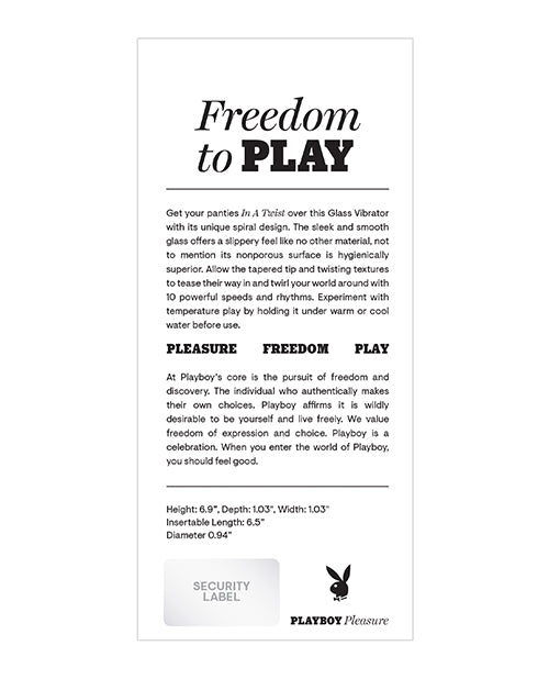 Experience unparalleled pleasure with the Playboy Pleasure In the Twist Glass Vibrator, designed to elevate your intimate moments. Its unique spiral design promises an exhilarating experience that will keep you coming back for more.Crafted from sleek, smooth glass, this vibrator offers a luxurious feel unlike any other material. The nonporous surface ensures superior hygiene, while the tapered tip and twisting textures provide delightful stimulation. With 10 powerful speeds and rhythms, you can explore a variety of sensations, and the option for temperature play allows you to tailor your experience by warming or cooling the vibrator before use.Don’t wait to transform your pleasure routine. Add the Playboy Pleasure In the Twist Glass Vibrator to your collection and discover a new realm of excitement today.Product Details:• Allow the tapered tip and twisting textures to tease their way in and twirl your world around with 10 powerful speeds and rhythms.