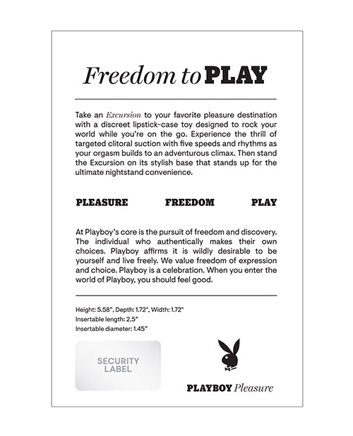 Experience an exhilarating journey of pleasure with the Playboy Pleasures Excursion Clitoral Suction Vibe in sleek black. This discreet lipstick-case toy is crafted to deliver intense sensations while fitting seamlessly into your on-the-go lifestyle.The Excursion features five distinct speeds and rhythms, allowing you to customize your experience for maximum satisfaction. Its targeted clitoral suction is designed to build anticipation and lead you to thrilling climaxes, making it an essential addition to your intimate moments. Plus, its stylish base not only adds elegance but also provides convenient storage on your nightstand.Don’t miss the chance to elevate your pleasure experience. Discover the ultimate in discreet satisfaction with the Playboy Pleasures Excursion Clitoral Suction Vibe and make every moment count.Product Details:• Experience the thrill of targeted clitoral suction with five speeds and rhythms as your orgasm builds to an adventurous climax.
