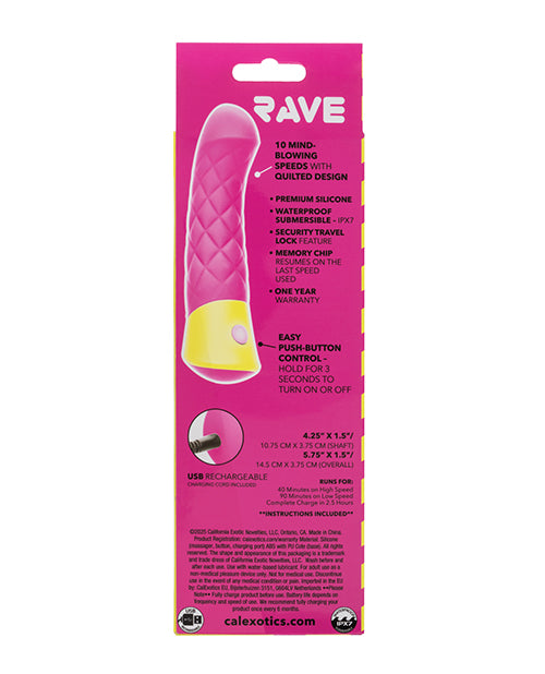 Experience the ultimate pleasure with the Rave Quilted G, a luxurious massager that transforms your intimate moments into exhilarating adventures. Its deep, rhythmic vibrations are expertly designed to awaken your senses and elevate your satisfaction.Crafted from body-safe silicone, the Rave Quilted G boasts an elegantly quilted design that combines style with functionality. With a gently curved silhouette and 10 powerful vibration speeds, this massager targets your most sensitive areas to deliver a customized experience. Plus, its IPX7 waterproof rating means you can take it into the bath or shower, adding a splash of excitement to your routine.Dont wait to unlock the pleasure you deservemake the Rave Quilted G a part of your collection today. Elevate your self-care rituals and indulge in a world of sensation that awaits you.Product Details:• Its fully waterproof, IPX7 submersible rating allows for exciting adventures in the bath, shower, or wherever passion leads.• Discover the power of 10 speeds of intense vibration, expertly crafted to target your most sensitive spots.• Its USB rechargeable with a full charge in just 2.5 hours, offering 40 minutes of high-speed fun and up to 90 minutes on low.• One Year Warranty.