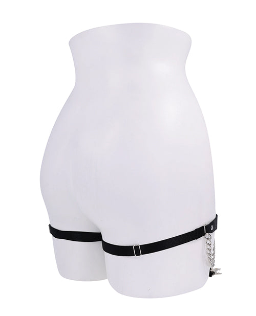 Transform your outfit with the Sex & Mischief Chain Lace Garters, where bold allure meets sophisticated elegance. These garters not only elevate your look but also amplify your confidence, making every moment feel more intimate and enticing.Crafted from lace-etched faux leather, these garters exude sensuality while maintaining a refined edge. The striking metal ring at the center adds a touch of boldness, while cascading chains enhance the design with a sultry flair. Designed for both style and function, these garters feature a secure clip that ensures your thigh-high stockings stay perfectly in place, making them a must-have accessory for any daring ensemble.Indulge in the perfect combination of daring and elegance with these stunning garters. Dont miss out on the chance to elevate your wardrobe and embrace your sensual side; add the Sex & Mischief Chain Lace Garters to your collection today.