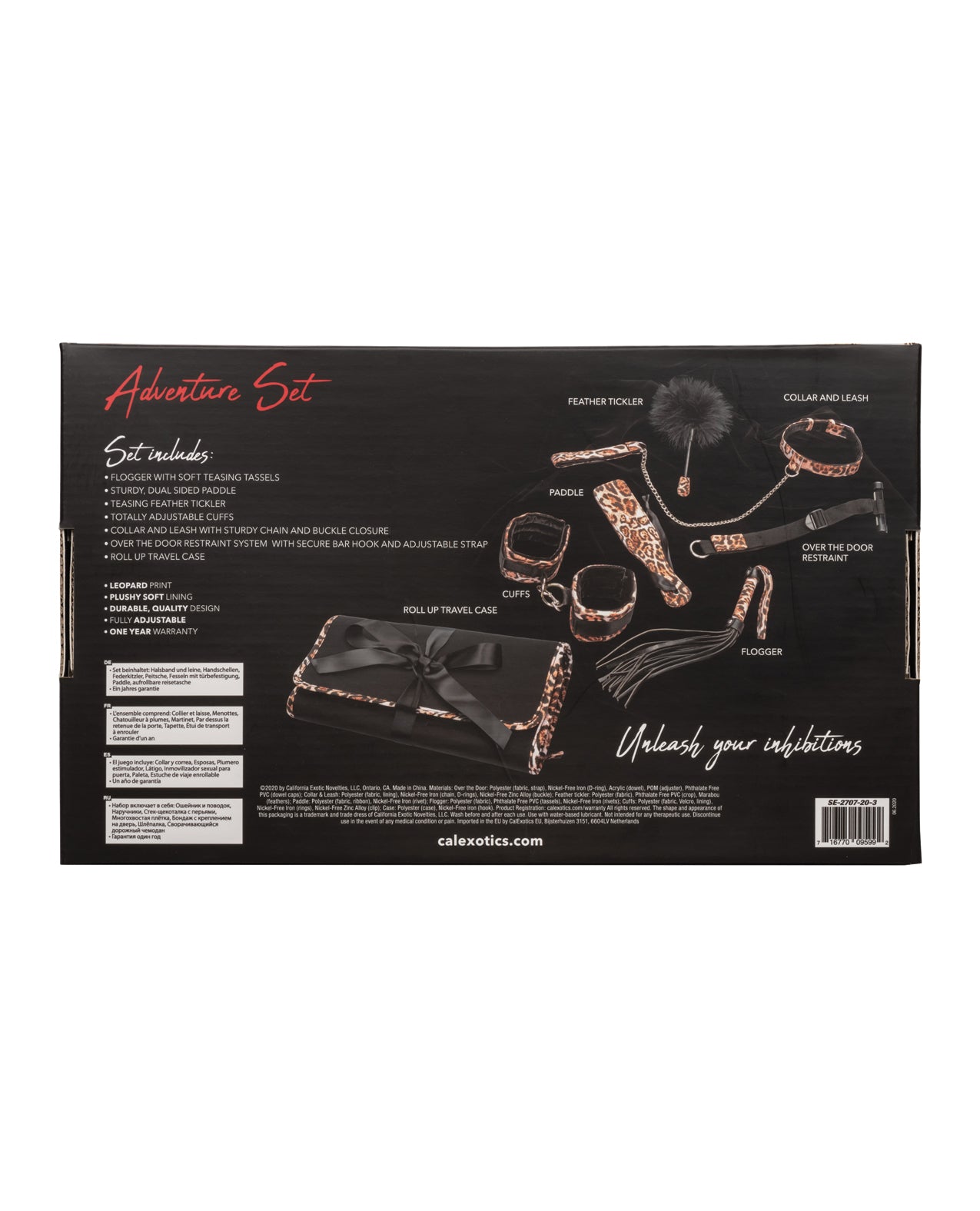 Unleash your wild side with the Unleashed Adventure Set – Animal Print, a thrilling exploration of pleasure and submission. Designed for those who crave excitement, this set elevates intimacy to new heights, creating unforgettable experiences for you and your partner.This travel-ready adventure kit features seven essential pieces, expertly crafted to blend style and functionality. Enjoy the sensation of the faux leather flogger, the satisfying impact of the dual-sided paddle, and the gentle teasing of the fluffy feather tickler. The padded collar and chain leash add an element of restraint, while the over-the-door restraint system allows for effortless setup in any space. Complete with versatile cuffs featuring adjustable Velcro enclosures, you can indulge in sensual play by wrapping them around wrists or ankles, enhancing the thrill of submission.Dont wait to dive into this captivating world of desire and exploration. Get your Unleashed Adventure Set – Animal Print today and transform your intimate moments into exhilarating adventures.