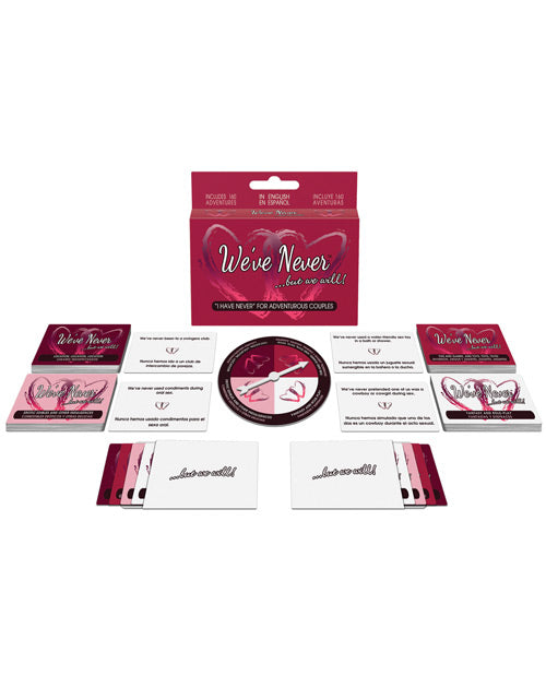 Unleash your adventurous spirit with “We’ve Never…But We Will,” the board game that transforms your intimate moments into thrilling opportunities for exploration. This game invites couples to share experiences and aspirations, turning every card drawn into a toast to new possibilities.Featuring 160 engaging cards, this game covers various categories, from exotic locations and playful activities to tantalizing edibles and fantasies. Each card encourages couples to celebrate what theyve done together while sparking excitement over what lies ahead. Whether youre enjoying a quiet night in or hosting a lively gathering, this game promises hours of adult fun and connection.Don’t miss the chance to deepen your bond and ignite your imagination. Grab your favorite beverages and toast to adventure with “We’ve Never…But We Will” today!Product Details:• Includes: 40 Location, Location cards; 40 Fun and Games, and Toys, Toys, Toys.