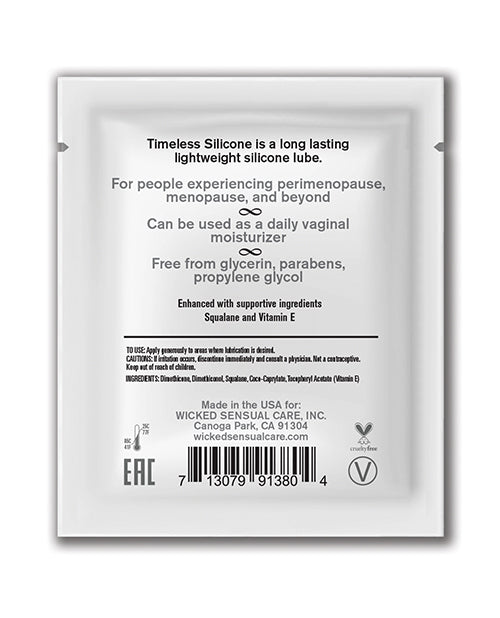 Experience the ultimate in intimacy with Wicked Sensual Care Simply Timeless Silicone Lubricant. This specially formulated lubricant caters to the unique needs of individuals navigating perimenopause and menopause, ensuring a comfortable and pleasurable experience.Simply Timeless stands out with its blend of nourishing ingredients, including aloe, olive leaf extract, squalane, and Vitamin E, all designed to combat dryness and enhance satisfaction. Unlike other products, it is free from glycerin, parabens, and propylene glycol, making it a safe choice for sensitive skin. This 0.2 oz bottle is perfect for on-the-go convenience, allowing you to maintain intimacy wherever life takes you.Dont let dryness hold you back from enjoying your most intimate moments. Discover the difference with Wicked Sensual Care Simply Timeless Silicone Lubricant and elevate your experience today.